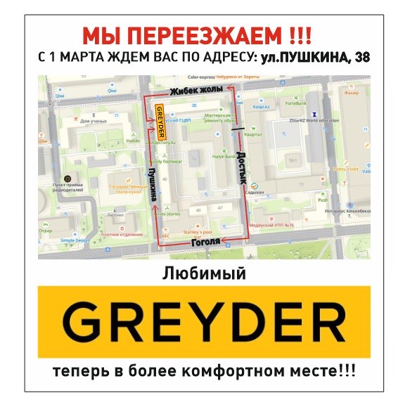 В связи с реконструкцией ТЦ «КВАРТАЛ», мы переезжаем на ул.Пушкина, 38. Приходите на новое место за новой обувью GREYDER 1-го марта! Мы будем ждать Вас!
